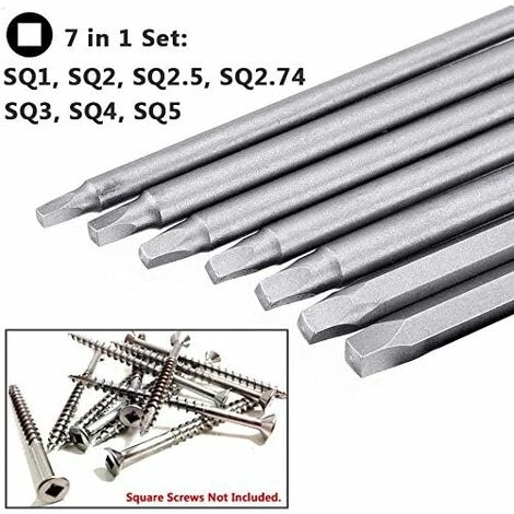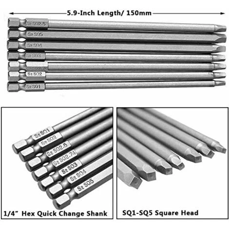 [Plus de Sélection de Taille] 7pcs différentes tailles: SQ1, SQ2, SQ2.5, SQ2.74, SQ3, SQ4, SQ5, les embouts de tournevis carrés peuvent répondre à vos différents besoins. [Exécution Exquise] Cet ensemble d’embouts de tournevis à tête carrée, une exécution exquise, chaque bord peut être verrouillé avec précision, sans endommager la vis et la tête de tournevis. [Application Large] Queue hexagonale de 1/4″et longueur de 6″/150mm). Peut être utilisé avec un tournevis électrique, un tournevis manuel, une perceuse électrique, des outils généraux de groupe, de l’air et tout autre porte-embout standard. [Haute Qualité] Fabriqué en acier S2 de haute qualité pour des performances et une durabilité professionnelles.Ensemble de 7 embouts de tournevis à tête carrée magnétique longue avec tige hexagonale de 1/4″, longueur de 5,9″