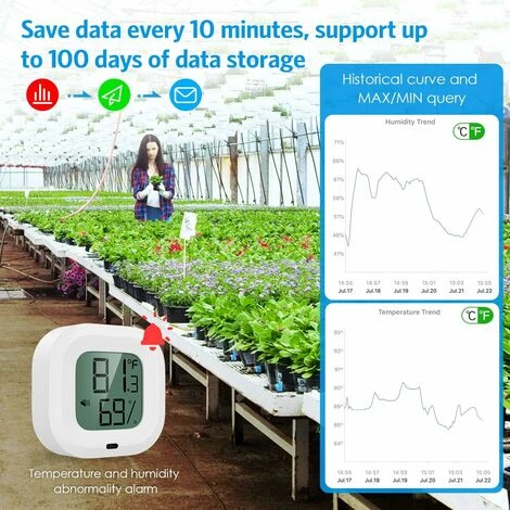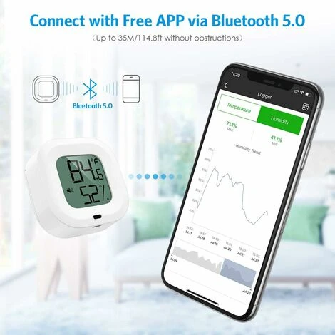 Description du produit Hygromètre à thermomètre Bluetooth, surveillez et suivez facilement la température et l’humidité de votre maison. Surveillez facilement les données de température et d’humidité à distance sur l’application via Bluetooth. Jusqu’à 35 mètres de distance de connexion (sans obstacle) vous permet de surveiller la température et l’humidité à distance. Remarque: Ce produit est la version Bluetooth (pas la version Wifi). Veuillez activer le Bluetooth sur votre téléphone et assurez-vous que votre téléphone portable est plus proche de l’appareil lors du couplage. Veuillez noter que la distance de connexion dans la maison est normalement de moins de 35 m. S’il y a un obstacle dans la plage de mesure, les données de mesure peuvent ne pas changer ou ne pas être connectées. Design compact Notre hygromètre à thermomètre sans fil est plus petit que les autres (taille: 50 x 50 x 12 mm), peu encombrant et portable. Fonctionnalités: Compact et léger La batterie peut être remplacée. Mesures fiables Aimant au dos Alerte température / humidité Enregistrement de données de 100 jours Bluetooth envoie les données à l’application lorsqu’il est de retour Moniteur plus précis En utilisant un capteur de température et d’humidité à sensirion précis et sensible, il peut obtenir une erreur de température de ± 0,5 ℃ (± 1 ℉), une erreur d’humidité de ± 5% et se rafraîchir une fois par seconde pour une plus grande précision. Exportation de stockage de données: Prend en charge la fonction d’exportation de données de température, enregistre un groupe de données toutes les 10 minutes, peut stocker jusqu’à 100 jours de données. Vous pouvez générer les données d’historique au format CSV et utiliser Excel ou Google Sheet pour l’ouvrir. Rappel d’alarme Vous pouvez définir la valeur la plus élevée et la plus basse de l’alarme de température et d’humidité. Si la température ou l’humidité est hors de portée, l’alerte apparaîtra sur l’appareil. Les données sur l’APP apparaissent en rouge lorsque les données sont au-delà de la plage prédéfinie.