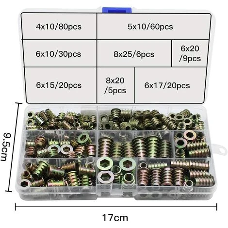 Information produit:Nom du produit: Vis à tête cylindrique à six pans creuxMatériel: ferTraitement de surface: galvaniséType de tête: tête hexagonaleTu auras:/b>80 pièces 4 * 10mm60 pièces 5 * 10mm30 pièces 6 * 10mm20 pièces 6 * 15mm20 pièces 6 * 17mm9 pièces 6 * 20mm5 pièces 8 * 20mm6 pièces 8 * 25mmNotes d’installation:/b>Besoin de percer un petit trou de taille appropriée avec une perceuse électrique,Utilisez une clé hexagonale pour le visser dans le trou,Ensuite, ajoutez 2-3 mm de colle à bois au trou (sur la paroi latérale).Insérez l’écrou et tournez-le plusieurs fois,Déposer ensuite 2-3 mm de colle sur le filetage de l’écrou,Tournez ensuite l’écrou de 180 degrés,Veuillez serrer complètement l’écrou,Après cela, l’écrou ne se desserre pas et est fermement connecté au bois.Remarque: /b>La profondeur du trou pré-percé doit être profonde jusqu’à la longueur de l’écrou inséré et le boulon peut être tourné au-delà de la profondeur de n’importe quelle partie de l’extrémité de l’écrou.