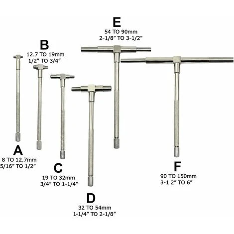 Jeu de jauges 6pcs: 5/16 « – 6 » (8mm – 150mm): Jauges 8-12.7, 12.7-19, 19-32, 32-54, 54-90 et 90-150mm. Vous pouvez mesurer différentes tailles de trous avec cet outil de mesure de diamètre intérieur.