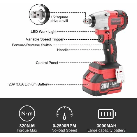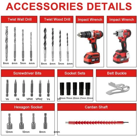 Ce que vous pouvez obtenir: 1 × clé à chocs sans fil TEENO, 1 x perceuse à percussion, 2 x batterie Li-ion 3,0 Ah, 1 x chargeur, 5 x clé à douille (18/19/20/22 mm), 6 x tête de vis Embouts, 8 × forets, 4 × jeux de douilles. 1 × arbre à cardan. Garantie 24 x mois.