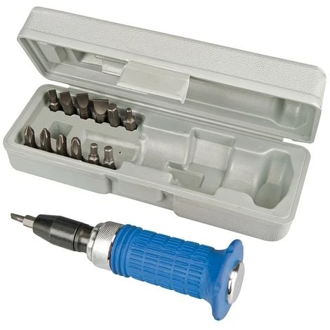 Action réversible vissage et dévissage. Poignée caoutchoutée avec épaulement protecteur. Embout carré 1/2 pour une utilisation avec des douilles. Avec 13 embouts en acier S2 : Phillips PH1, PH2, PH3 et PH4 , plats 5, 6, 8, 10 et 12 mm , 6 pans 4, 5, 6 et 8 mm. Finition satinée. Avec boîte de rangement.
