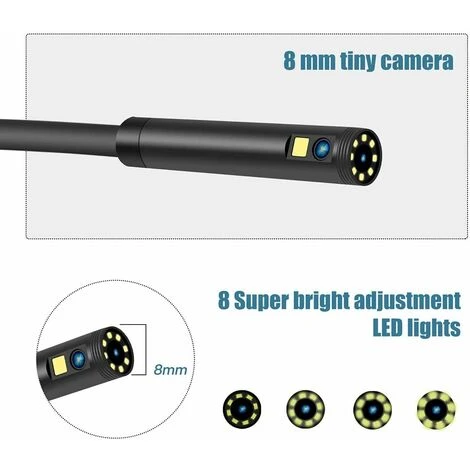 La meilleure distance focale claire d’environ 4 cm à 15 cm, les images et les vidéos peuvent être stockées sur la carte TF. (Carte TF 32G non incluse). - Sonde étanche: la tête et le câble de la caméra sont étanches IP67, l’endoscope a une sonde mince de 8 mm de diamètre avec 8 lumières LED réglables, fournit suffisamment de lumière pour les situations plus sombres. Notre caméra Len et les lumières