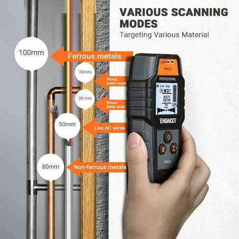 【2 modes et profondeur détective】Le détecteur mural possède 2 modes de balayage, précis et profondeur. Les 2 modes s’adaptent uniquement à la détection du bois : en mode exact, la profondeur de détection maximale jusqu’à 20 mm, en mode profondeur 38 mm. La profondeur maximale détective jusqu’à 100 mm