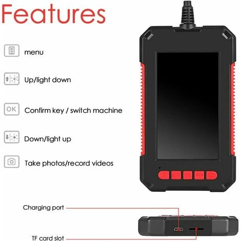 [Résolution HD 1080p, écran IPS 4,3 pouces] Caméra endoscope industrielle HD 1080p avec écran IPS 4,3, plus pratique pour effectuer une analyse en direct sur votre zone d’application et pour visualiser des photos et des vidéos HD instantanément. Plus clairement et résolvez efficacement le problème avec cette caméra d’inspection de tuyaux [Lumières LED réglables, sonde de 5.5 mm de diamètre] étanche IP67, 6 lumières LED réglables, vous pouvez régler la lumière LED pour obtenir le meilleur effet de vue en fonction de vos besoins. La caméra d’inspection flexible de 5.5 mm vous permet d’effectuer une inspection visuelle détaillée dans les zones difficiles d’accès, même dans l’obscurité totale ou sous l’eau [Longue distance focale, large application] Longue distance focale (4,1 à 502,9 cm) pour faciliter les inspections. Meilleure plage de mise au point de 3 à 10 cm. Le câble semi-rigide de est à la fois rigide et flexible. L’endoscope industriel est très pratique, excellent pour l’inspection mécanique, la réparation de voiture, les tuyaux, les travaux ménagers, les murs, la cheminée ou l’entretien de la climatisation.Description du produit