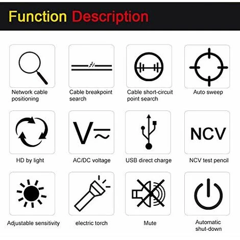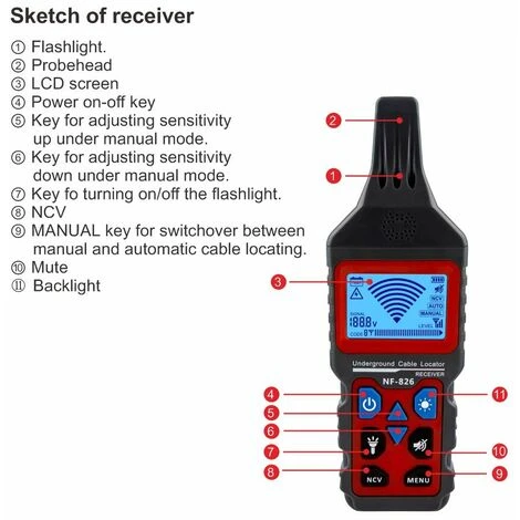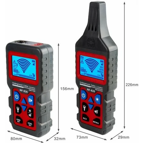 Écran LCD : Écran TN 52 x 35 mm avec rétroéclairage – Affichage de la puissance du signal reçu : √ Avertissement de batterie de l’émetteur : √ Fréquence du signal de réception : 125 KHzKMax. Distance de réception : Détection de court-circuit : √ Détection automatique de la fréquence d’échantillonnage : √ Mode de réception : Manuel / Fonction AutoNCV : AC : 50 ~ 400 V (50 ~ 60 Hz) +/- 2,5 % – Courant de fonctionnement maximum : Dimensions : 228 x 74 x 28 mm.