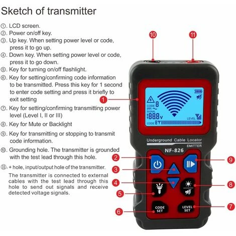 Clé : Clé en silicone – 8 codes de signal d’émetteur acceptables : 6 types – Amplitude du signal de l’émetteur : 3 degrés – Silencieux : √ Lampe : √ Rétroéclairage LCD : marche/arrêt – Alimentation : 3,7 V 1400 mAh batterie au lithium Tension de charge : Courant de charge DC5 V : < 600 mA.
