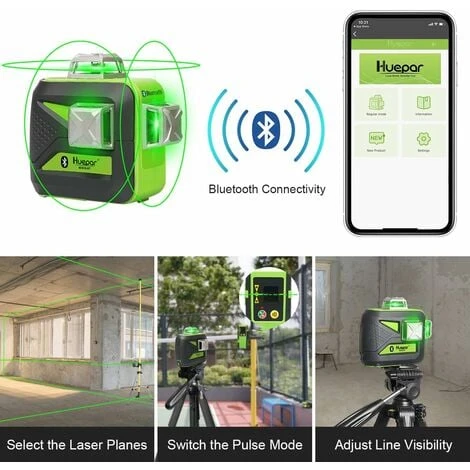 【Technologie Bluetooth】: Avec la connectivité Bluetooth, les utilisateurs peuvent contrôler la configuration du laser depuis l’ensemble de la pièce avec un téléphone intelligent et l’application Huepar. L’application Huepar est disponible en téléchargement gratuit et peut être utilisée pour activer / désactiver les lignes laser et le mode impulsion, sélectionner le ou les plans laser, régler la visibilité de la ligne et émettre une alarme de niveau incorrect.