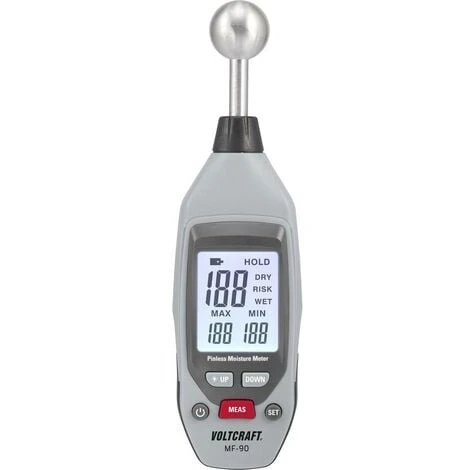 Détermination rapide et non-destructive de l’humidité des matériaux avec le VOLTCRAFT MF-90 Protégez les matériaux de construction de votre maison ou de votre logement et détectez l’humidité avant que les moisissures ne se forment. L’humidimètre MF-90 permet d’effectuer des mesures d’humidité rapides et non-destructives dans les murs, les plafonds et les sols. Cet appareil est adapté à tous les types de matériaux de construction. Beaucoup de fonctions supplémentaires incluses La fonction HOLD permet une mesure fiable, même si vous ne pouvez pas lire l’écran pendant la mesure. Elle permet une mémorisation temporaire du résultat de la mesure. Le MF-90 est équipé d’une fonction MIN/MAX qui enregistre la valeur minimale et maximale mesurée. Il vous permet de connaître le taux d’humidité des matériaux utilisés dans les murs ou les surfaces. Grâce à la fonction d’alarme, il est possible de programmer avant la mesure les valeurs devant déclencher une alarme.