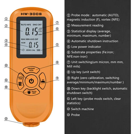 La jauge prend la sonde intégrée précise et utilise les principes de l’induction électromagnétique et l’effet de courant de Foucault, qui détecte automatiquement l’attribut des substrats.