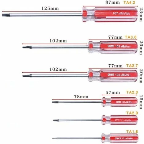 Contenu de l’emballage : lot de 6 tournevis triangulaires de taille comprenant : 1,8 mm, 2,0 mm, 2,3 mm, 2,7 mm, 3,0 mm, 4,2 mm