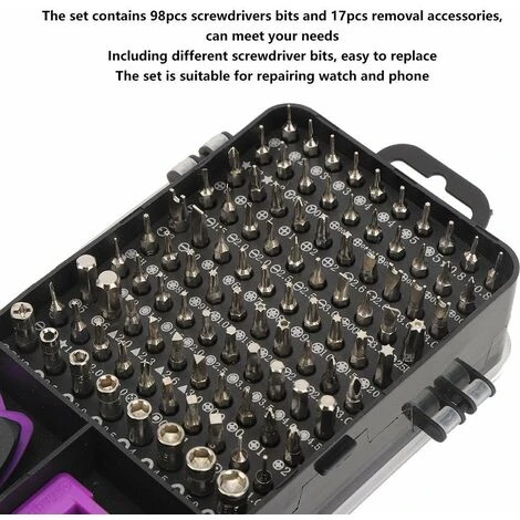 Détails du kit d’outils 115 en 1 : 98 embouts de tournevis + 17 accessoires de démontage
