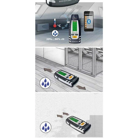 Instrument universel de mesure de l‘humidité de l‘air et de l‘humidité des matériaux avec capteur escamotable du climat ambiant avec l‘interface Bluetooth