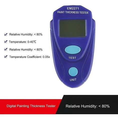 Traits:Remarque : la précision est de 2 % rdg0,1 mm ou 2 % rdg4mil (mesure généralement)Alimentation par pile bouton 1 pièce 3V, CR2032 ou équivalent. (Éloignez la pièce isolante de la batterie avant utilisation)Étalonnage automatique, Maintien des données. Taille mini avec écran LCD. Deux unités disponibles : mm/mil.Principalement utilisé pour mesurer de manière non destructive l’épaisseur de la peinture de la voiture.La plage de mesure est de 0,0 à 2,0 mm ou de 0 à 80 mil.La description:Ce testeur est conçu pour mesurer de manière non destructive l’épaisseur des revêtements non magnétiques (y compris la peinture, l’émail, le plastique, l’époxy, etc.) sur le fer, l’acier ou l’aluminium.Sur la base de la sécurité du transport aérien, veuillez ouvrir le capot arrière et éloigner la pièce isolante des batteries.Caractéristiques:Plage de mesure : 0,0 mm à 2,0 mm ; 0mil à 80milPrécision : 2 % de lecture 0,1 mm ou 2 % de lecture 4 milRemarque : Précision à la température de fonctionnement de 23 degC degC et à une humidité relative ne dépassant pas 75 %.Résolution : 0.1mm/1milSource de courant :1 pile bouton 3V, CR2032 ou équivalent (Éloignez la pièce isolante de la pile avant utilisation)Environnement d’exploitation:Température : 0-40 degrésHumidité relative : 28 degC)Environnement de stockage :Température :-10 à 50Humidité relative : < 80 %Taille : 6,8 x 3,8 x 2 cmcomprend : 1 x testeur d’épaisseur de peinture numérique1 x CR2032