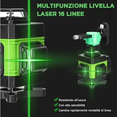 Niveau laser vert 4D 16 lignes:Le niveau laser produit 16 lignes laser, 8 lignes horizontales, 8 lignes verticales et 10 lignes transversales, ce qui facilite le collage au sol, au plafond et les travaux de plâtrage. La ligne laser peut être modifiée en fonction des besoins du travail. Un niveau laser peut être utilisé à de nombreuses fins.