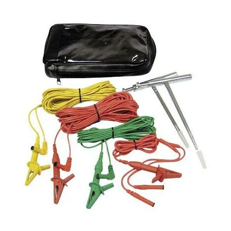 Le set est fourni avec une sacoche de transport, 2 fils en T (18 cm de long), 3 cordons de mesure avec pinces crocodiles (20 m de rouge, 10 m de jaune, 5 m de vert) et un autre câble pour l’ERT 200 ou ERT 201.