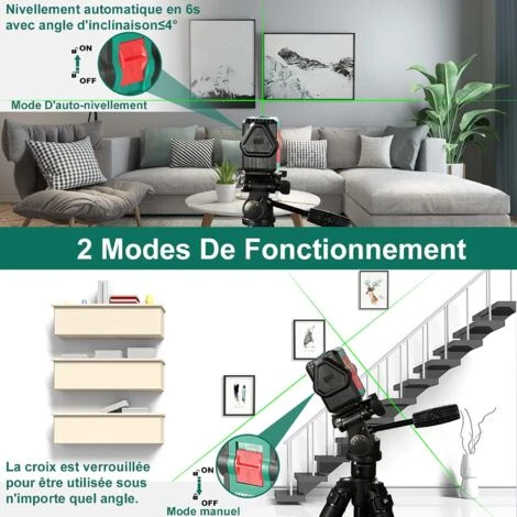 - Le niveau laser à nivellement automatique est automatiquement nivelé à un angle d’inclinaison de ≤ 4 ° degrés.