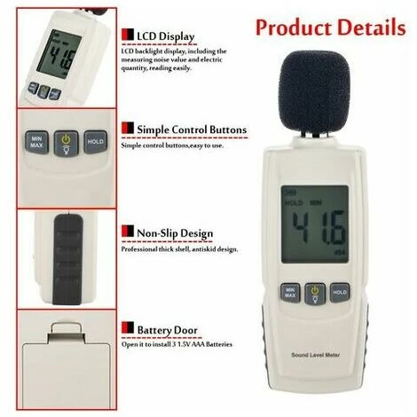 2.Gamme de mesurer du Sonomètre Numérique: 30~130dBA; Précision: +/- 1,5 dB; Résolution: 0,1 db; Enregistrements Max / valeurs Min tous le temps.
