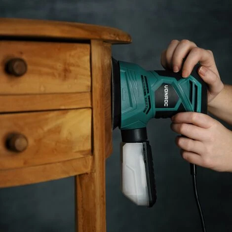 - Cette ponceuse orbitale aléatoire a un design très compact et léger qui la rend facile à utiliser avec seulement une main. En combinaison avec la poignée à prise souple, la ponceuse repose confortablement dans la main pendant le ponçage.