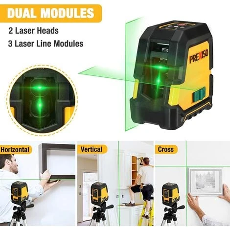 【Double Module et 3 modes de projection】PREXISO Niveau Laser dispose de deux sources laser. Le niveau laser de la tête laser professionnelle est plus précis. Il projette des lignes lumineuses horizontales, verticales et croisées à 3 modes sur des surfaces planes et des niveaux, et est plus stable par rapport aux autres équipements courants