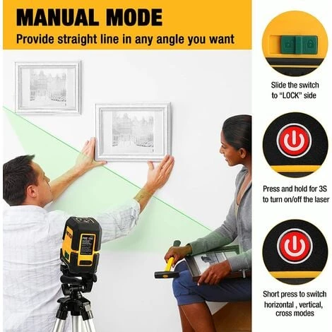 【Mode d’auto-nivelant & mode manuel】Glisser l’interrupteur sur le côté déverrouillé, il est en mode d’auto-nivelant, ainsi l’outil se mettra à niveau s’il se trouve à ± 4 ° de l’horizontale. Si la surface s’incline de plus de 4°, les lasers clignotent et le voyant LED (verrouillage) devient rouge. Quand il est sur le côté verrouiller et appuyez sur le bouton 3S pour allumer le laser en mode manuel, l’auto-nivelant est désactivée et verrouiller les lignes pour l’alignement sur d’autre angle
