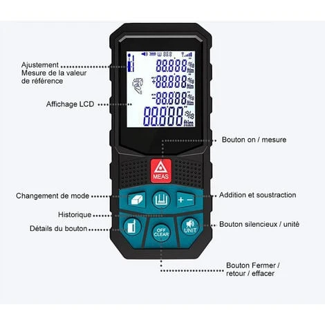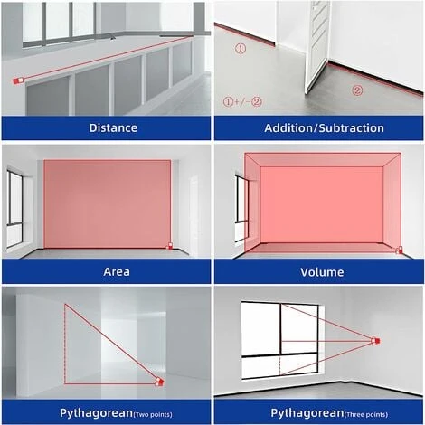 Fonctions de mesure multiples – Surface, distance, longueur, volume, mesure continue, méthode de Pythagore-trois points; Addition et soustraction; indication de batterie faible; mémoire de données de 20 groupes; suppression manuelle des données; arrêt automatique après 150s sans opération pour économiser l’énergie.