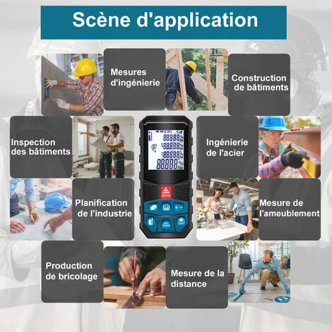 Conception durable et pratique – Le niveau étanche IP54 et la fonction anti-poussière protègent au maximum la mesure de distance laser; la taille portable et le corps en caoutchouc dur offrent une bonne prise en main; la dragonne vous permet de maintenir le mètre stable et de le transporter facilement.