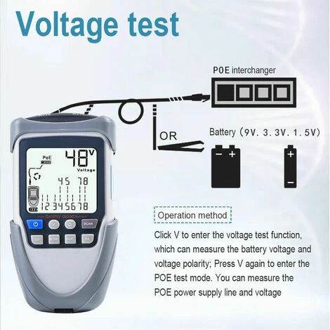 Fonction de test de tension : vous pouvez cliquer sur « V » pour accéder à la fonction de test de tension, qui peut mesurer la tension de la batterie et la polarité de la tension, et vous pouvez appuyer à nouveau sur « V » pour accéder au mode de test POE. Vous pouvez mesurer la ligne et la tension des alimentations POE.