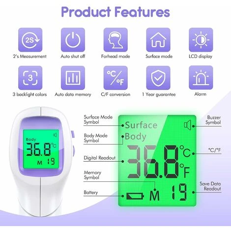【2 modes de mesure et 3 couleurs de rétro-éclairage】Il y en a 2 modes de mesure sur notre termometre médical frontal, dont mode de Corps(La plage de mesure est de 86,0 à 109,4 ° F (32,0 à 43,0 ° C)), et mode de Surface(La plage de mesure est de 32,0 à 212,0 ° F (0 à 100 ° C)). Et 3 couleurs de rétroéclairage(Vert, Orange, Rouge) qui changent avec la température mesuré en mode de Corps.