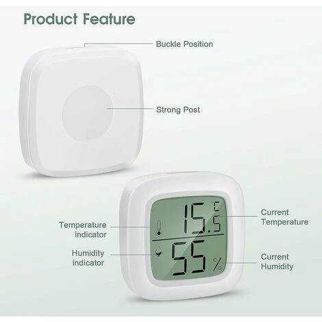 sur une surface en fer, comme un réfrigérateur. - Applications largement utilisées: le mini thermohygromètre thermomètre numérique LCD est très populaire et est souvent utilisé dans les salons, serres, salles d’instruments, caves à vin, entrepôts, stockage de céréales, chambres de bébé et armoires.