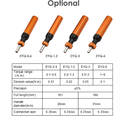 4 modèles en option, avec différents couples réglables, entraînement hexagonal 1/4″ (6,35 mm) pour plug-in remplaçable, livré avec 2 embouts de tournevis (fente/croix).