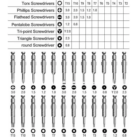 10 “Torque”; 5 “cruciforme”; 4 “têtes fendues”; 2 “étoiles”; 1 “triangle”; 1 “tri-wing”; 1 “rond”.