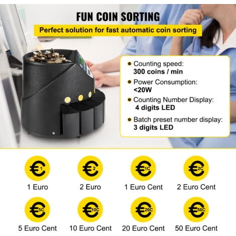 - Triage Precis des Pieces : Notre compteuse de pieces compte et trie avec precision toutes les pieces en euros (1 centime, 2 centimes, 5 centimes, 10 centimes, 20 centimes, 50 centimes, 1 euro et 2 euros) a une vitesse de 270 pieces par minute. Elle peut facilement compter et trier vos pieces dans le bon tiroir en quelques minutes pour gagner du temps et reduire la main deœuvre.