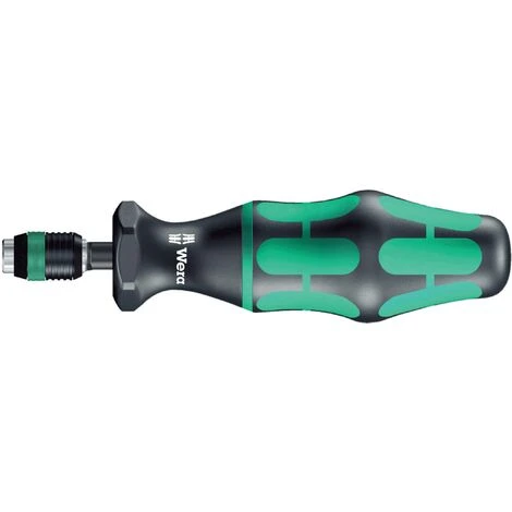 Tournevis Wera. Avec couple préajusté valeur pour toutes les utilisations pour lesquelles le même couple constant est nécessaire et précision de répétition est exigée. La valeur de couple peut être modifiée à l’intérieur de la plage de mesure. La technologie à changement rapide Rapidaptor pour un remplacement rapide des embouts. Couple de desserrage illimité pour desserrer les vis bloquées. Poignée Kraftform avec zones dures et souples. Adaptée à des vitesses de travail élevées. Protège les mains. Adapté pour les embouts avec entraînement à 6 pans extérieurs 1/4 selon DIN ISO 1173-C 6,3 et E 6,3 (ISO 1173).